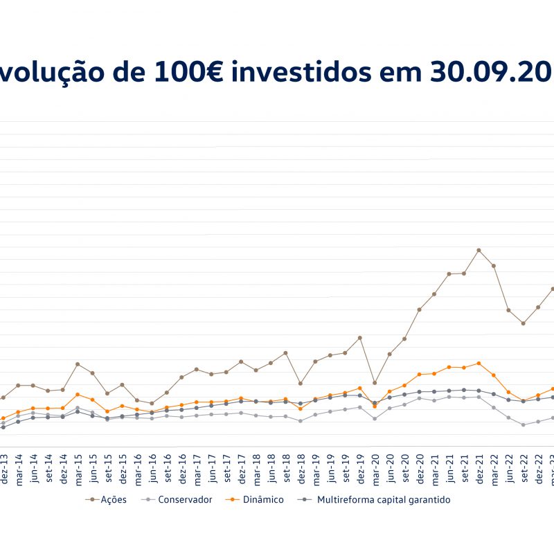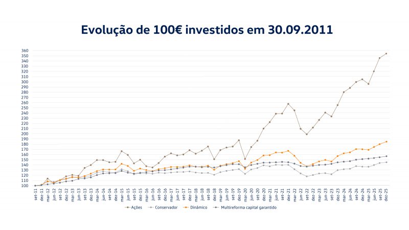As linhas representam a evolução de um investimento único de 100€ efetuado à data de 30/09/2011 durante o período decorrido até 31/12/2025, para cada um dos fundos.